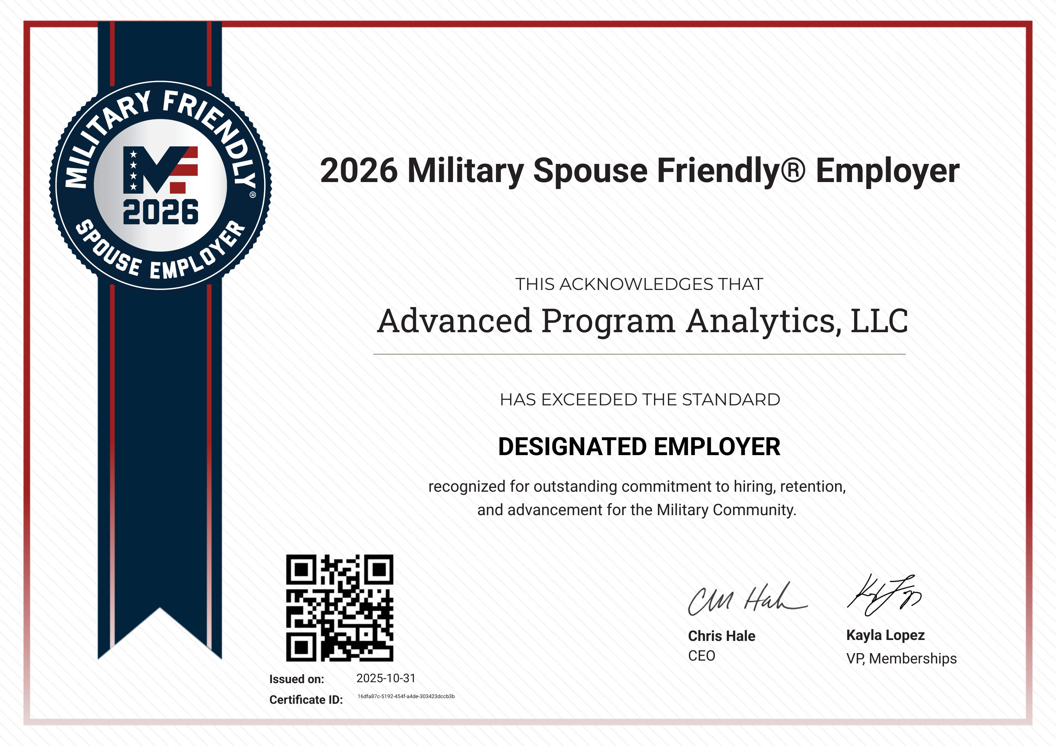 11/07/2024 – Advanced Program Analytics, LLC has been named to annual Vet100 list—a compilation of the nation’s fastest growing veteran-owned businesses. The ranking, created in partnership with Inc. Business Media and Syracuse University’s D’Aniello Institute for Veterans and Military Families (IVMF), was born out of the iconic Inc. 5000 list of the fastest-growing private companies based in the U.S. Both distinctions are considered hallmarks of entrepreneurial success. APA ranked at #994!! Thank you to the entire APA team for allowing us to receive such recognition!